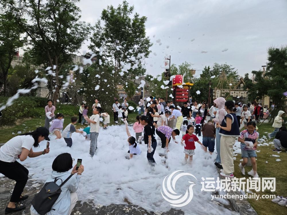 景區(qū)內(nèi)巨型鹽石和卡通萌獸組成的“七彩鹽石童話王國(guó)”,憨態(tài)可掬的鹽精靈玩偶,各種彩雕,通過(guò)趣味造型拉近與游客的距離,引得大人、孩子爭(zhēng)相合影。頗受孩子們喜愛(ài)的還有泡沫大戰(zhàn)。隨著設(shè)備啟動(dòng),潔白的泡沫如雪花般傾瀉而出,瞬間將場(chǎng)地變成了童話世界。孩子們歡呼雀躍地沖進(jìn)這片“雪海”,有的揮舞雙手感受泡沫輕撫臉頰,有的在蓬松的泡沫堆里追逐打鬧,還有的捧起泡沫相互嬉戲。清涼的觸感與飛揚(yáng)的泡沫交織,此起彼伏的尖叫聲和歡笑聲回蕩四周,家長(zhǎng)們也被這份童真感染,紛紛加入其中,共同享受這難得的親子歡樂(lè)時(shí)光。