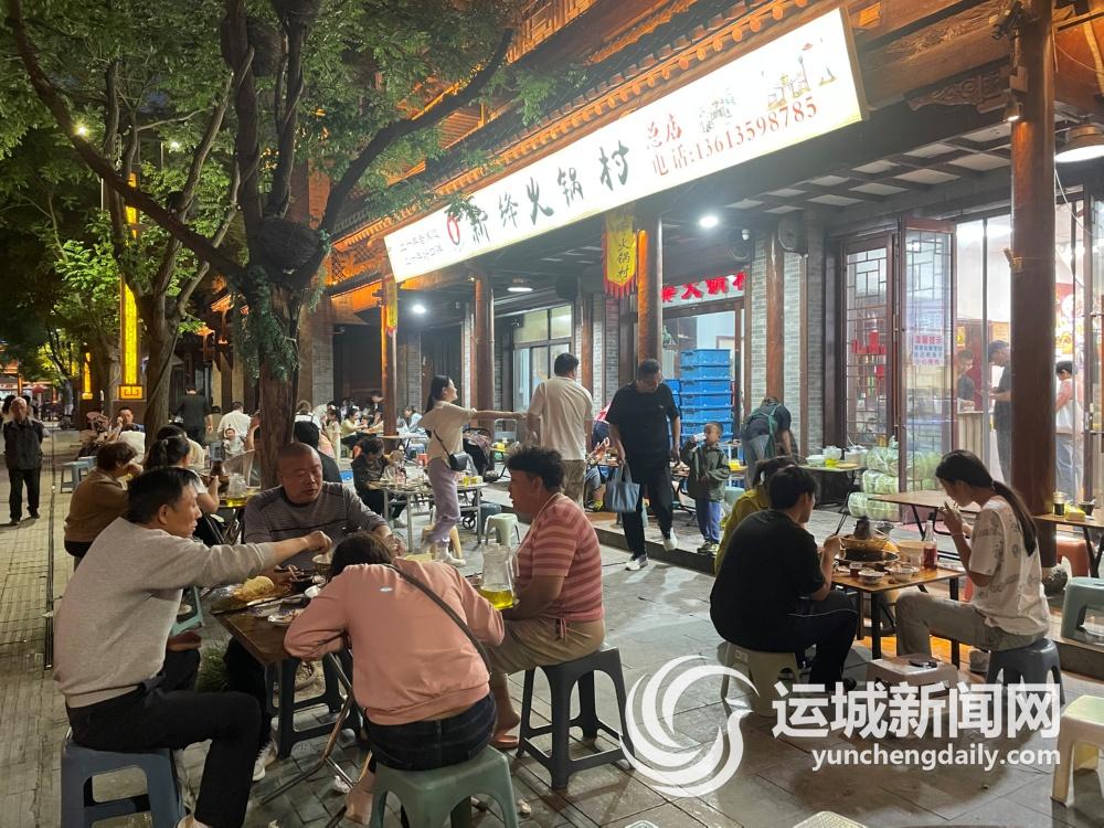 今年“五一”假期,大量游客涌入盬街。在這里,鮮肉餛飩、新絳銅火鍋、鹽焗雞等各種美食琳瑯滿目。一路走去,羊肉在炭火上烤得嗞嗞作響;地?cái)偱E糯钆渖厦刂漆u汁令人垂涎不已;饃夾菜口感豐富,讓人回味無窮;串串香、餅子夾串等各種特色小吃也都各有千秋。游客有的圍坐在一起吃著熱氣騰騰的火鍋,有的手拿小吃三五成群穿梭其中,有的則帶著孩子在石雕前“打卡”拍照,盡享夜晚的愜意時(shí)光。