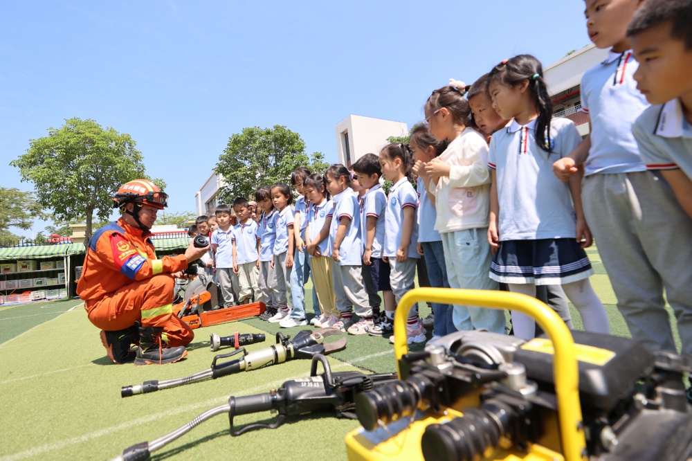 5月12日,在福建省廈門市翔安教育集團濱海幼兒園,翔安區消防救援大隊消防員為孩子們介紹消防器材裝備的用途和使用方法。