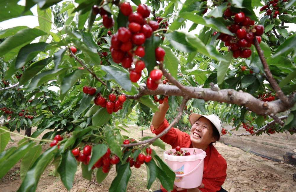 5月13日,山東省臨沂市郯城縣薛城后村村民在采摘大櫻桃。