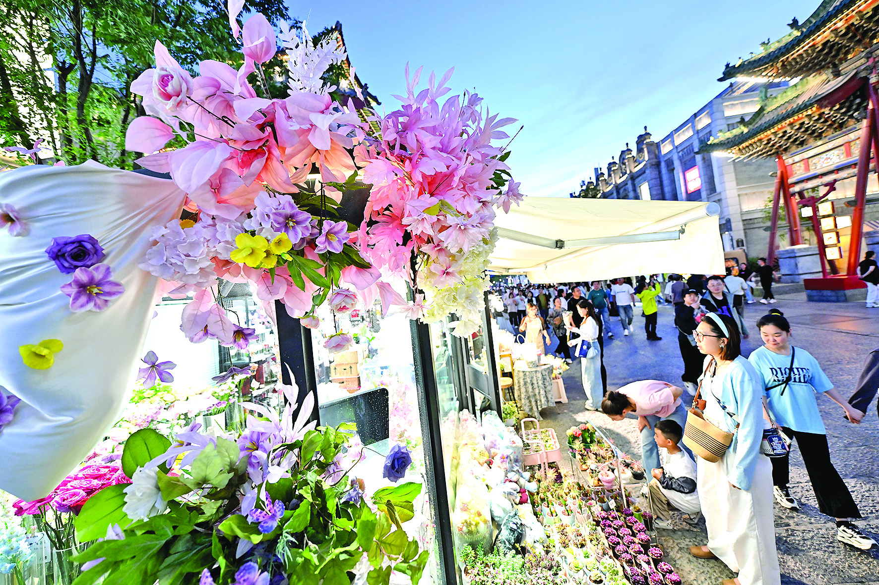 ▲5月14日,游客在太原市鐘樓街選購鮮花。 夜幕降臨,太原市鐘樓街、食品街等特色街區及汾河兩岸流光溢彩、游人如織。近年來,太原市不斷豐富夜經濟消費業態,開展多種夜間活動,打造集美食、觀光、購物等于一體的夜經濟消費圈,豐富市民游客夜生活。 新華社記者