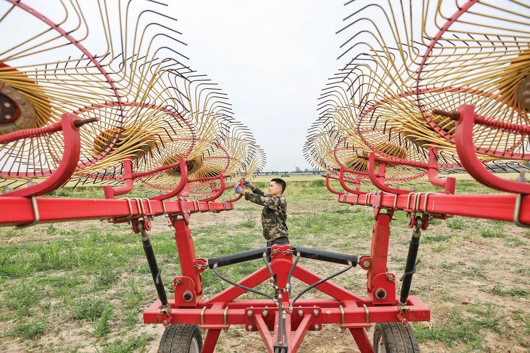 5月13日,農機技術人員在河南省平頂山市寶豐縣鬧店鎮檢修摟草機,為麥收做準備。新華社發(何五昌 攝)