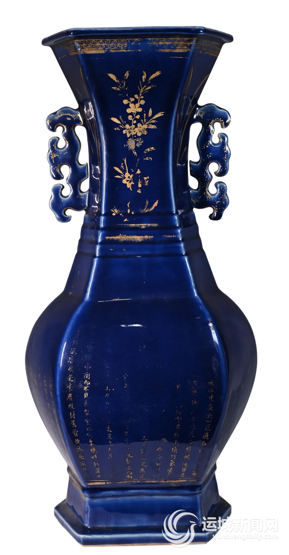 在中國陶瓷藝術的浩瀚星空中,清代瓷器以其工藝之精、品類之繁、裝飾之美而獨樹一幟。鹽湖區博物館館藏的這件清代藍釉描金花卉詩文雙耳瓶,莊重典雅,造型獨特,霽藍釉與金彩的華貴搭配彰顯了不俗的氣派,是一件融合了造型藝術、釉彩工藝、繪畫技巧與文學意蘊的精品。