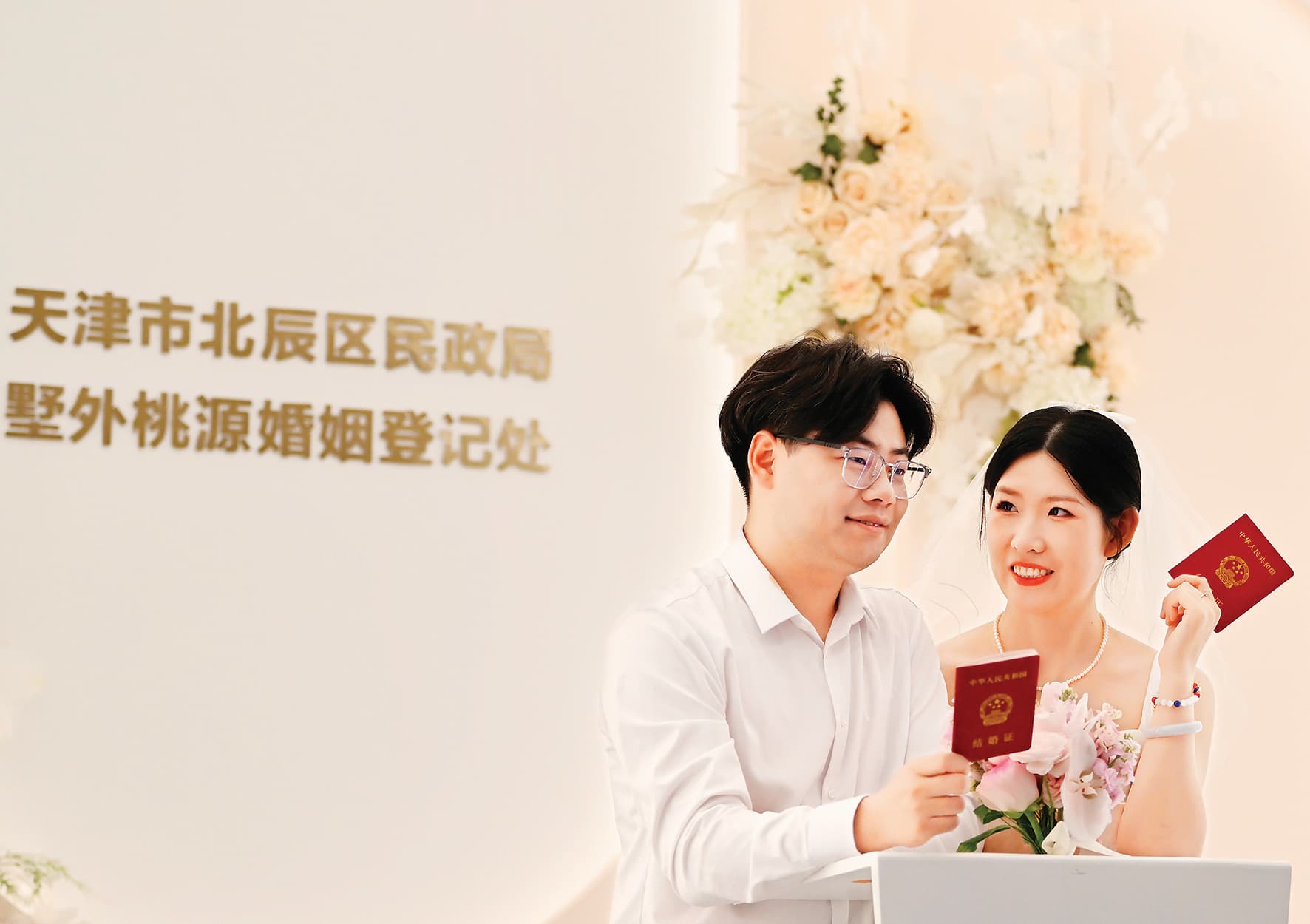 5月20日,在天津市北辰區民政局墅外桃源婚姻登記處,一對新人手持結婚證合影留念。 因“520”有“我愛你”的寓意,眾多新人選擇在5月20日這一天登記結婚。 新華社記者 李 然 攝