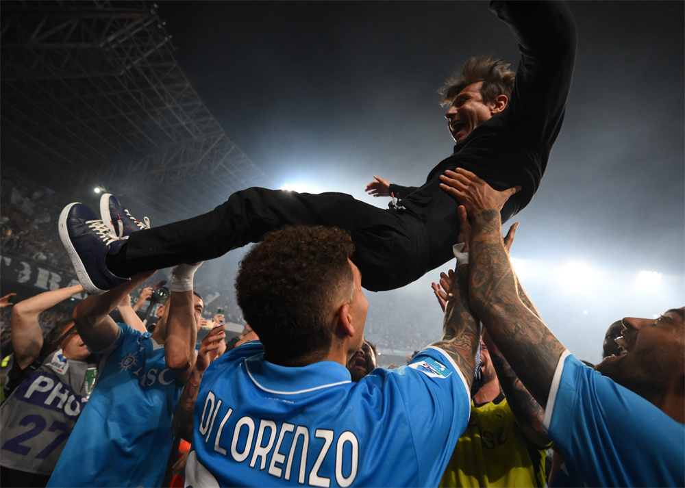 5月23日,那不勒斯隊球員將主教練孔蒂(上)拋起,慶祝奪冠。
