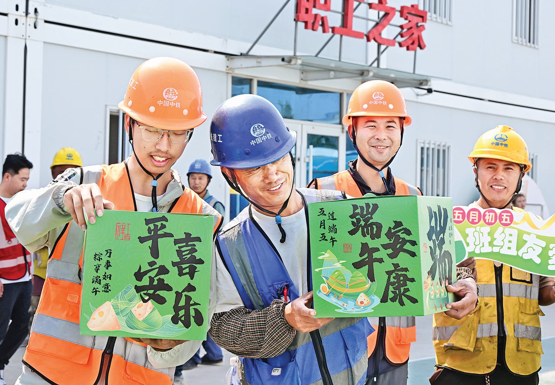 5月29日,中鐵建工青島火車北站地下空間項目部組織工人開展“鄉音話端午 幸福粽相伴”班組主題日活動。工人們通過分享各自家鄉端午節習俗,參加投壺、射五毒、吃粽子比賽等趣味活動,迎接端午節的到來。新華社記者 李紫恒 攝