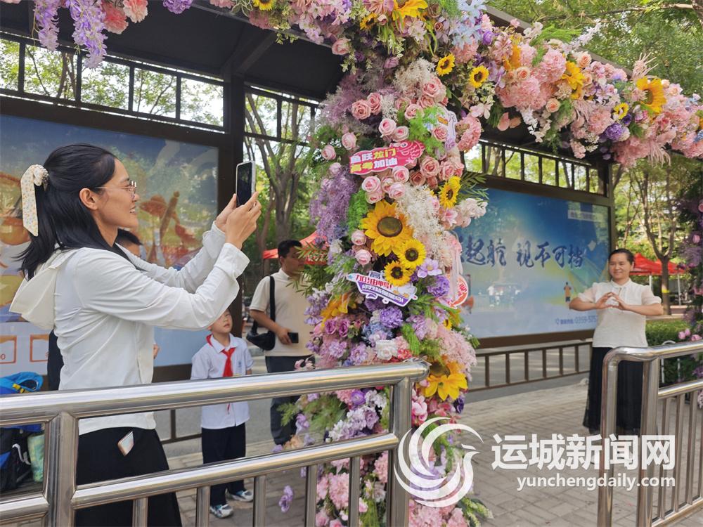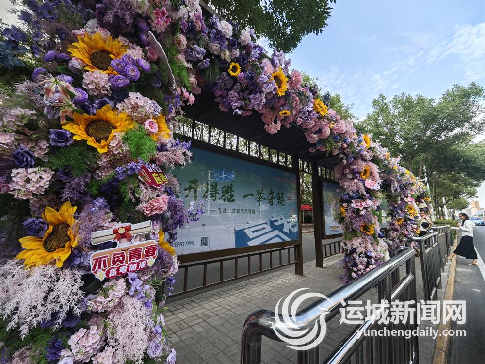 6月7日,記者來到運城中學考點南門附近,首先被兩座花團錦簇的公交站臺吸引。4000余枝顏色鮮艷的仿真花朵,將站臺裝點成一片花海,寫有“為夢而戰、沖刺高考”“金榜題名”“一舉奪魁”“旗開得勝”等字樣的加油祝福語標牌點綴其間,營造出青春洋溢的氛圍。