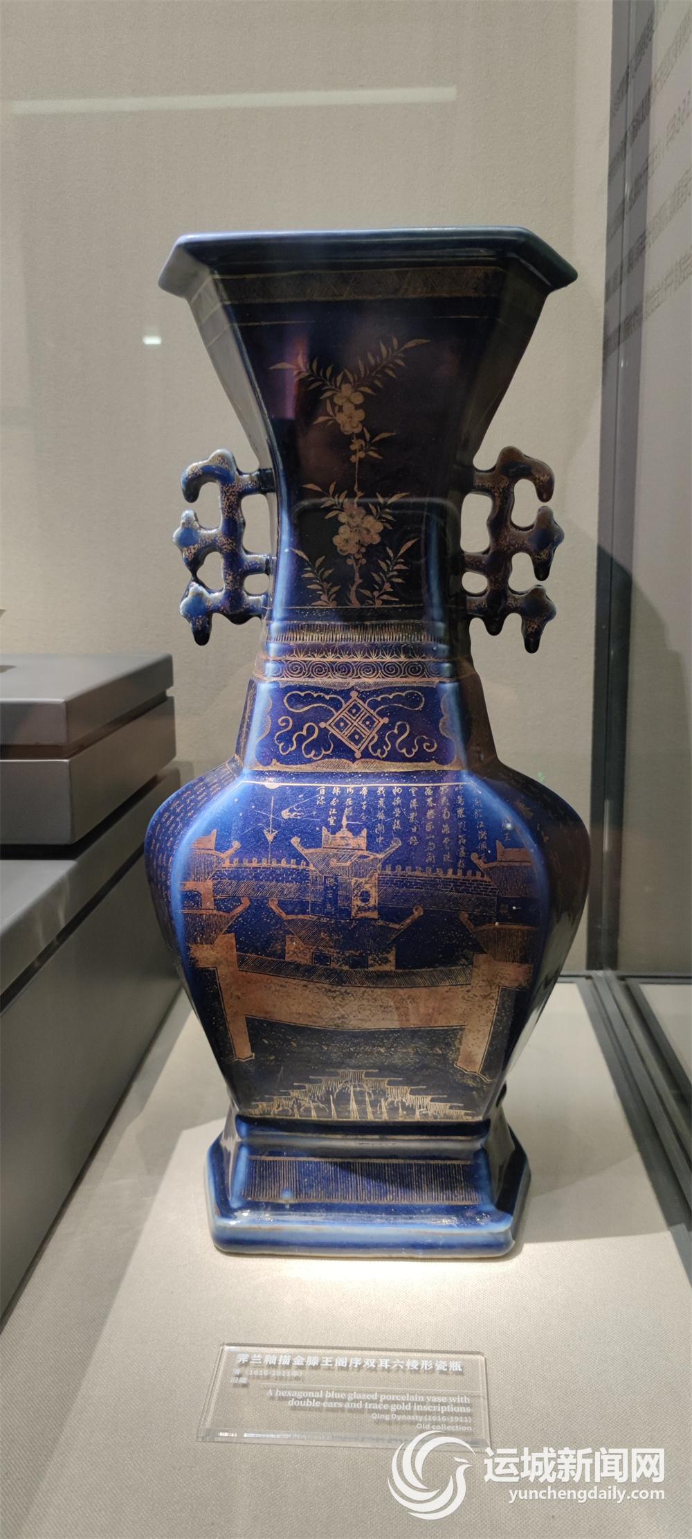 臨猗縣博物館展出的霽藍釉描金滕王閣序雙附耳六方形瓷瓶 記者 劉亞 攝