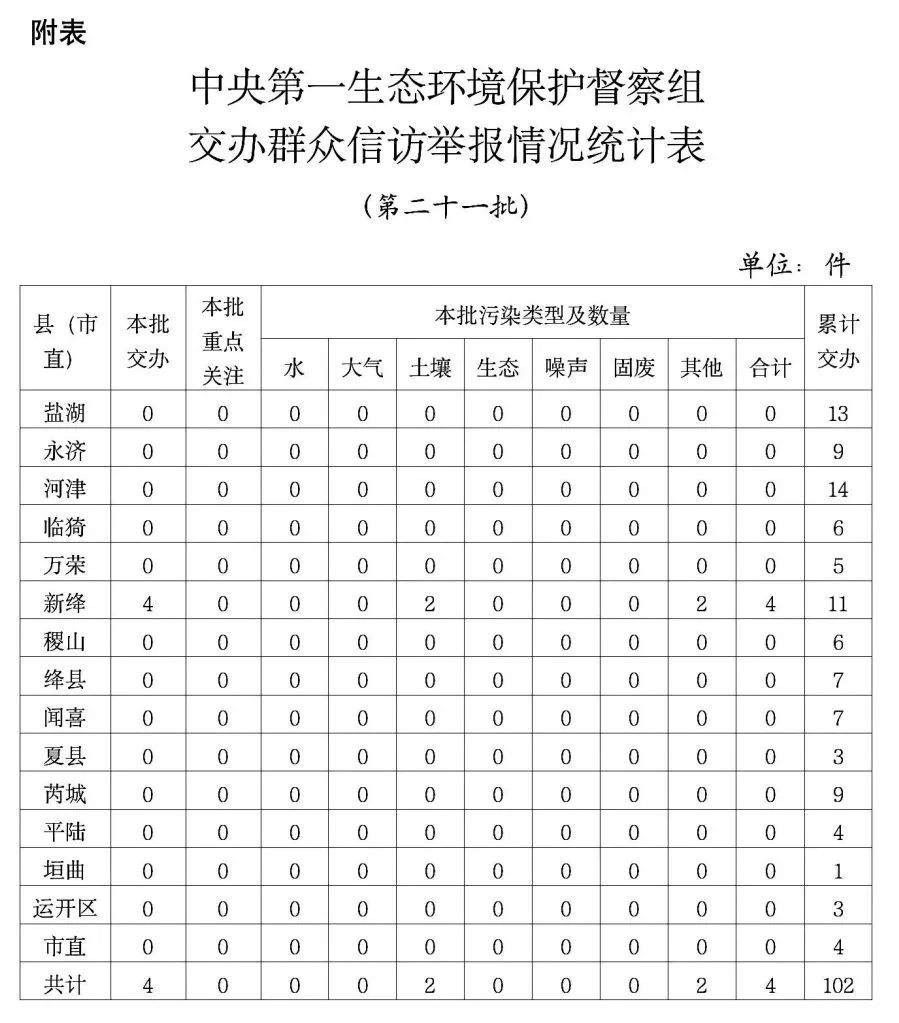2025年6月18日,中央第一生態(tài)環(huán)境保護督察組向我市交辦的第二十一批信訪舉報件,共4件;交辦舉報件中重點關(guān)注件0件。按區(qū)域和部門劃分,新絳縣4件。本批轉(zhuǎn)辦的信訪件,涉及生態(tài)環(huán)境問題4個,其中,土壤污染問題2個、其他污染問題2個。
