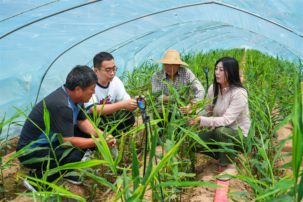 仲夏的東張聯村姜田里,半人高的姜苗郁郁蔥蔥。駐村工作人員劉娟妮與技術員踩著田埂蹲進苗叢,輕輕撥開密葉查看根系。“須根比上周多了一倍!”技術員捏著沾泥的根須贊嘆。十余名種植戶湊近細看青翠的苗稈,有人伸手比量著高度笑嘆:“這長勢,秋收有指望了!”
