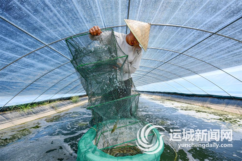 永濟市通過黨支部領辦合作社等多種方式發展壯大村級集體經濟。圖為專業養殖人員在永濟市開張鎮西開張村千畝南美白對蝦養殖基地捕蝦。