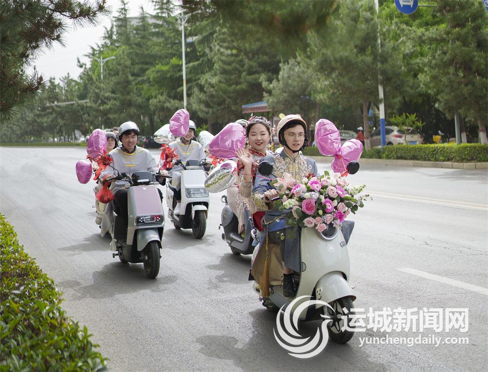永濟市深入推進移風易俗,積極倡導文明新風,持續營造讓彩禮“降溫”、為愛情“減負”、給幸福“加碼”的良好氛圍。圖為永濟市組織的“一對新人”騎行迎親活動現場。
