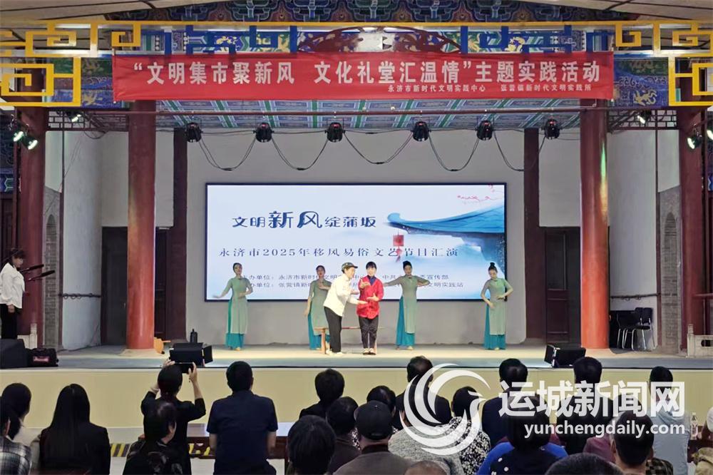 永濟市積極培樹文明鄉風,創作快板《人生宴席莫鋪張》、情景劇《退彩禮》等移風易俗精品節目,通過“接地氣”“有生氣”的文藝宣傳,讓文明鄉風浸潤人心。圖為永濟市開展“文明新風綻蒲坂”移風易俗文藝節目會演。