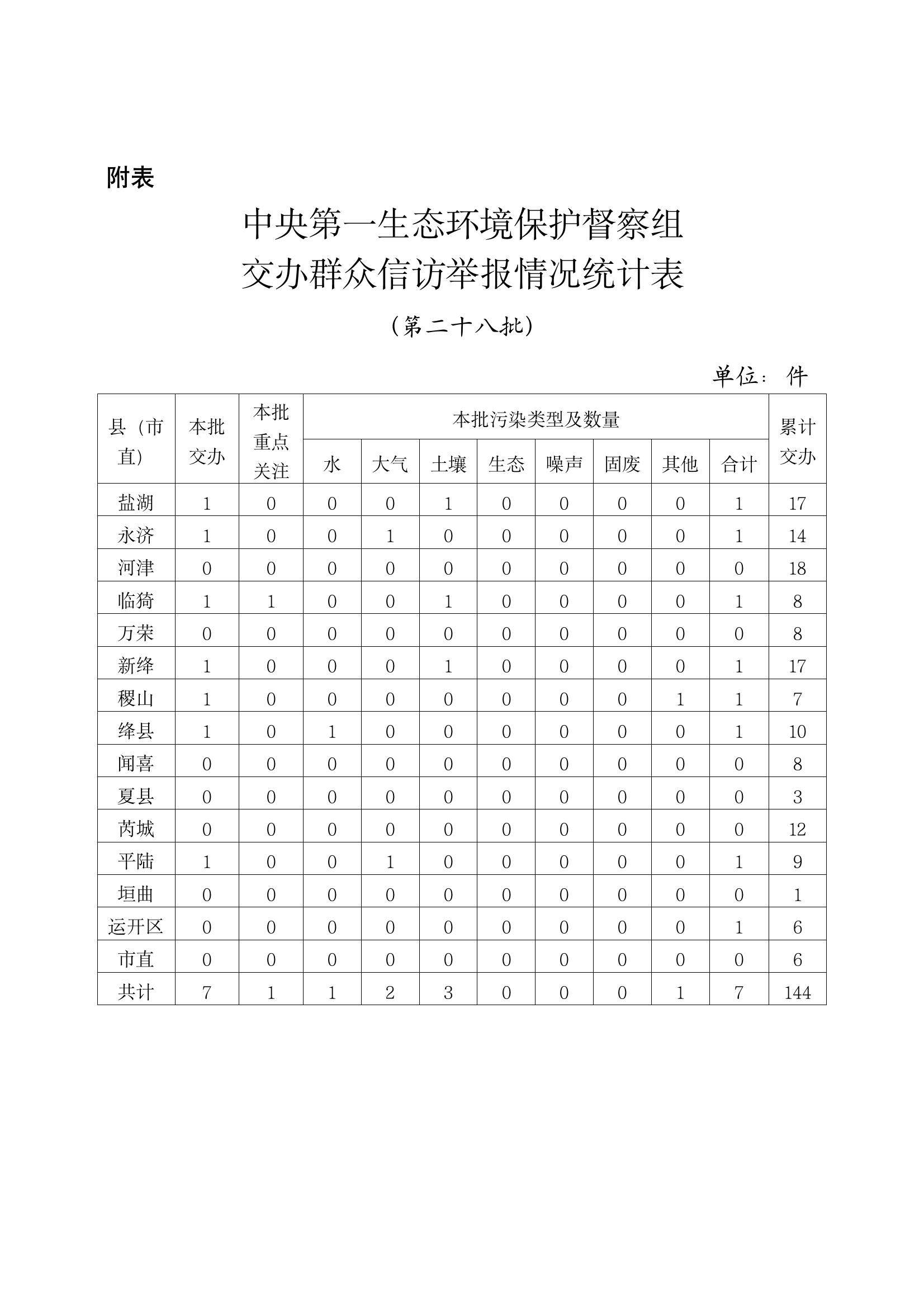2025年6月25日,中央第一生態環境保護督察組向我市交辦的第二十八批信訪舉報件,共7件;交辦舉報件中重點關注件1件(臨猗縣)。按區域劃分,鹽湖區1件、永濟市1件、平陸縣1件、絳縣1件、臨猗縣1件、稷山縣1件、新絳縣1件。本批轉辦的信訪件,涉及生態環境問題7個,其中,水污染問題1個、大氣污染問題2個、土壤污染問題3個、其他污染問題1個。