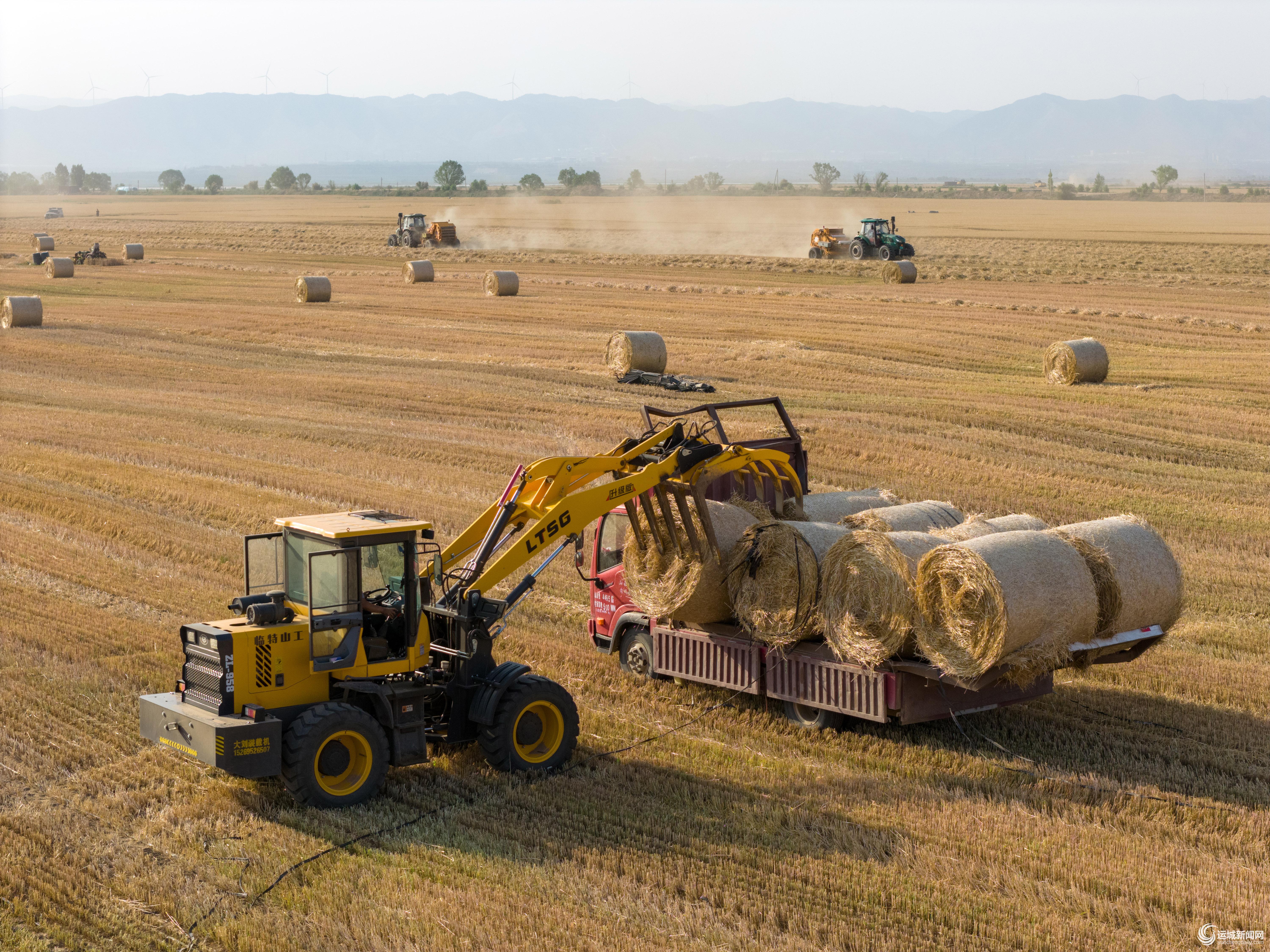 在廣袤無垠的黃河灘地,麥浪剛剛褪去金色的外衣,摟草機、秸稈打捆機等農機便迫不及待地轟鳴著駛入田間。只見摟草機前端的旋轉摟齒如同靈動的手指,貼著地面快速翻轉,將零散倒伏的秸稈輕柔聚攏;秸稈打捆機操控著機械巨臂,將散落的秸稈迅速吸入“腹中”,經過壓縮、捆扎等一系列精準操作,不一會兒,一個個緊實規整的秸稈捆便如同列隊的士兵,錯落有致地排列在田地里,成為夏日田野里一道別樣的風景線。