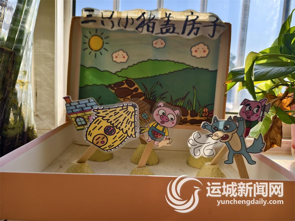 “三只小豬蓋房子”故事盒更是讓人眼前一亮,廢舊紙盒化身故事場景,簡單的卡紙剪出小豬、狼和房子,生動還原經典故事場景。還有那懸掛在教室天花板的花朵裝飾,以廢舊布料為花瓣,松果、藤球做花蕊,搭配綠植藤蔓,為教室增添了自然的生機,每一件作品都在傳達:廢品,也能綻放精彩。
