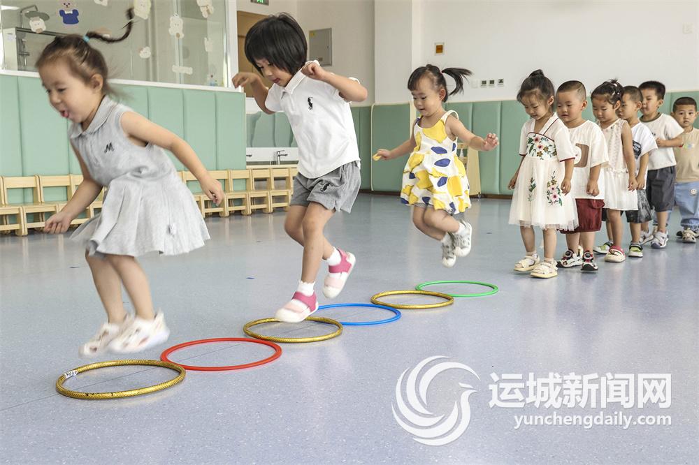 7月16日,在萬榮縣綜合托育服務中心,孩子們在列隊玩游戲。