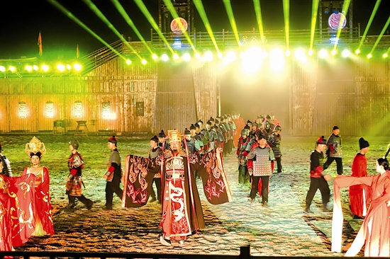 舞臺上,“馬上火壺”正在火熱上演,熱浪滾滾。幕后,車馬已就位,一飛迅速登車,伴隨著三聲號角,“秦王駕到”聲音響起,一飛和眾多演員們一起,在舞臺上帶來震撼的演出。高光時刻迎來觀眾陣陣喝彩。