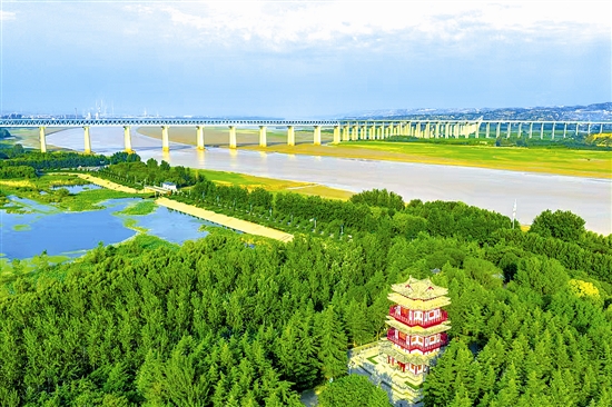 三門峽水利樞紐泄洪過后,黃河水流平緩,形成大片灘涂草地,與藍天、綠樹、大橋交相輝映,構成一幅綠意盎然的生態風景畫。 杜杰 攝