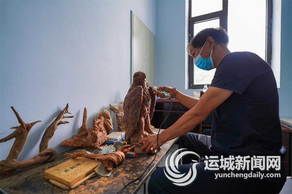夏縣圪馬溝村的兄弟根雕傳承人孫天龍在打磨根雕作品。
