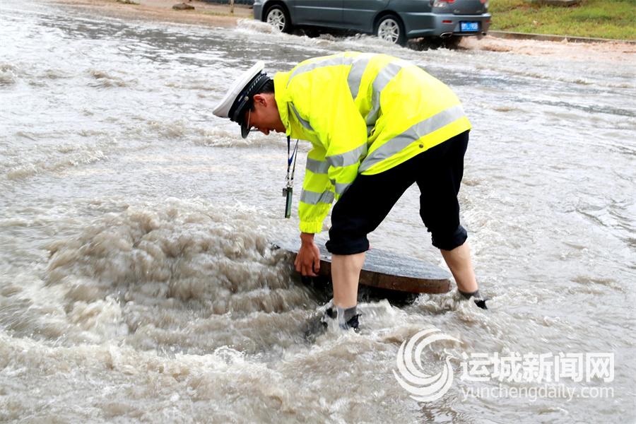 8月5日凌晨的暴雨中,鹽湖交警身著熒光綠制服,在雨幕如瀑的路口疏通積水。