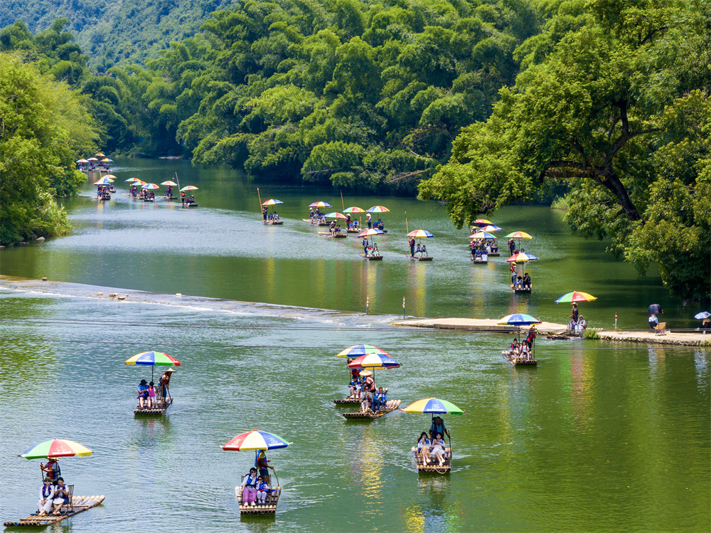 近日,人們在廣西桂林市陽朔縣遇龍河乘坐竹筏漂流。人們在伏天中享用瓜果冷飲、親水嬉戲游玩,用各種方式避暑消夏。 新華社發(何華文 攝)