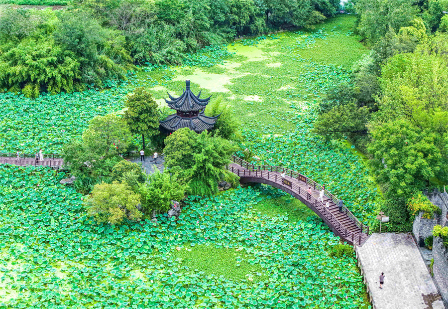 8月10日,游客在江蘇省揚州市江都區丁伙鎮樸園游玩。