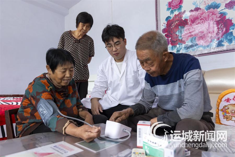 6月27日,絳縣磨里鎮炭元河村衛生室大學生村醫郅禹博指導高血壓患者進行血壓測量。