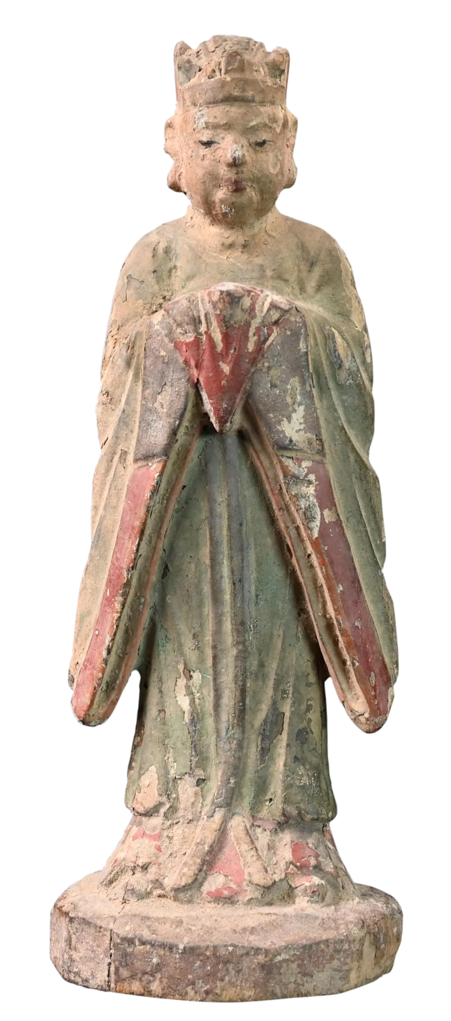 這件人物木雕像的一大亮點便是其彩繪。在沒有化工顏料的古代,人們從自然中取用礦物和植物顏料,從赤、青、白、黃、黑5種基本色出發,調制出豐富多彩的中國色,并將其運用于繪畫、木雕等領域。這件清代人物木雕像遍體施彩繪,盡管歷經數百年的風雨,部分色彩已經脫落或褪色,但殘留的色彩在今天看來依然明快鮮艷,足以讓人想象出它當初的絢麗模樣。這些彩繪不僅僅是為了美觀,更是當時社會文化與信仰的一種體現,反映了清代人們的審美觀念與精神追求。