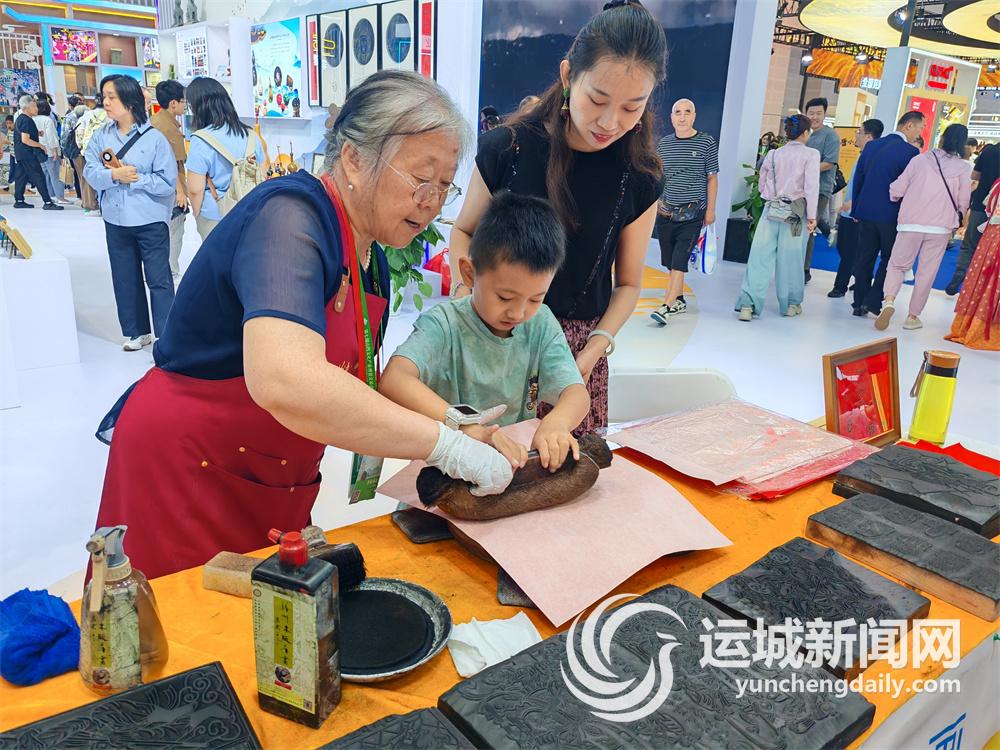 8月23日,山西文博會運城展館,來自太原的小朋友在體驗省級非遺絳州木版年畫制作技藝。