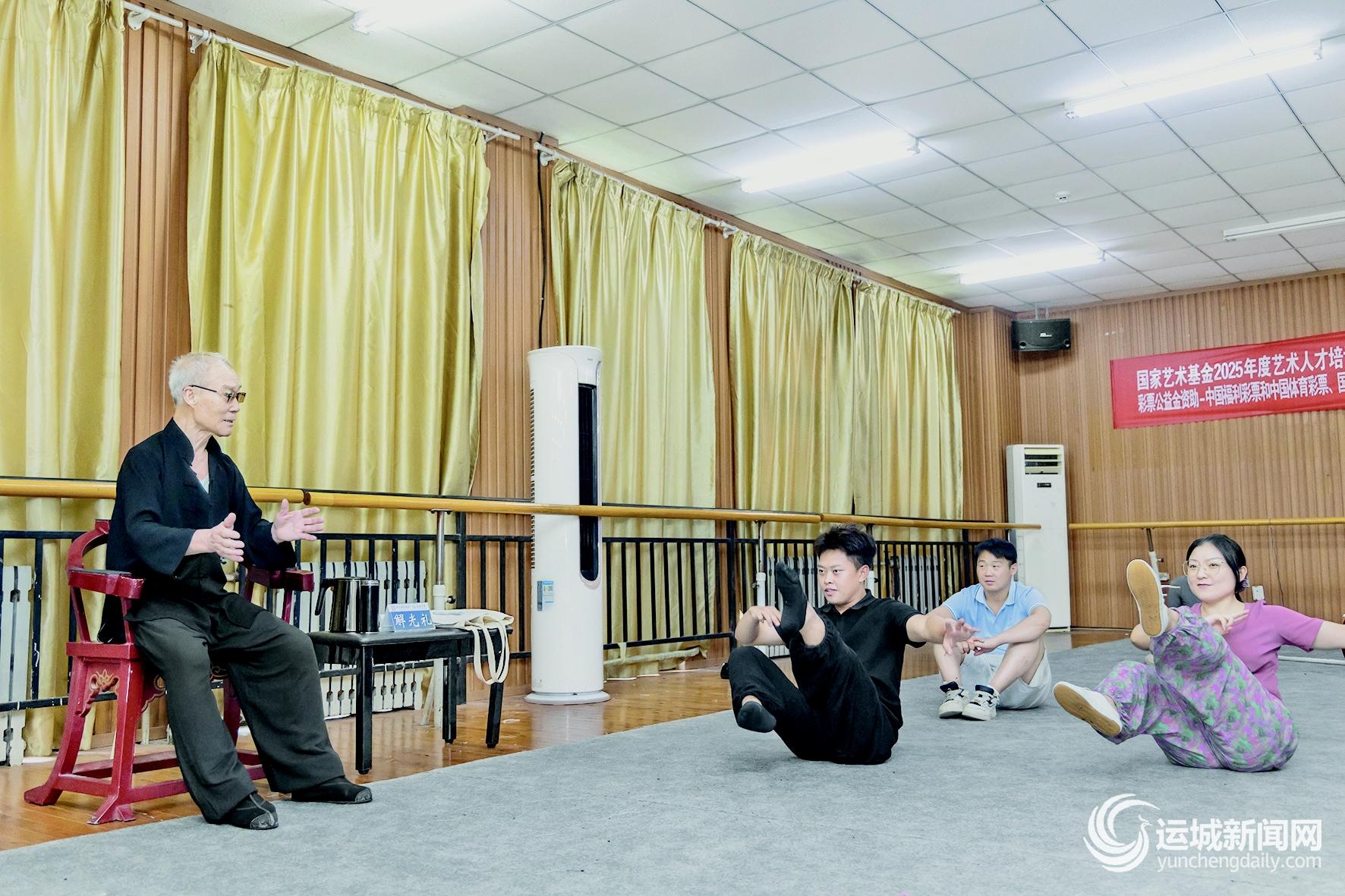 這是運城學院國家藝術基金蒲州梆子特技絕活青年表演人才培訓活動的傳習現場。老人名叫解光禮,原臨汾蒲劇團副團長,著名蒲劇武生、導演。他所傳授的功夫叫“亹(此處音wei)屁股”。