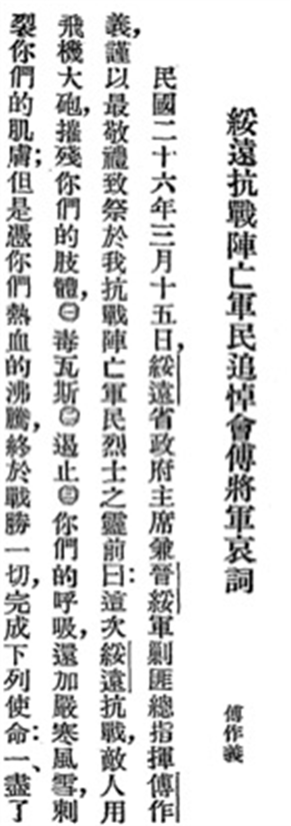 《標準國語課本》(韓學章編,霞飛書局1947年)節錄了傅作義將軍在綏遠抗戰之后的演講詞。他不為勝利沖昏頭腦,而是客觀地分析當時的情勢,呼吁全國人民團結起來,抵抗日本的侵略,“不然,就只有滅亡”。1937年上海童新書店印行《非常的國語》,全書分三部分,前兩部分揭露日寇在東北和華北的罪惡,第三部分主要與綏遠抗戰有關。其中《綏遠抗戰陣亡軍民追悼會傅將軍哀詞》一文,是傅作義將軍對陣亡將士的高度贊揚,他在講話中說,“現在中華民族正走上復興之路”,表現了其抗戰必勝的堅定信念。值得一提的是,這本教科書的封面設計不同一般,非常有視覺沖擊力:日寇的坦克履帶正碾壓而來,危機感迫在眉睫,而上方傅作義的題詞“喚起國魂”,更為醒目、震撼。