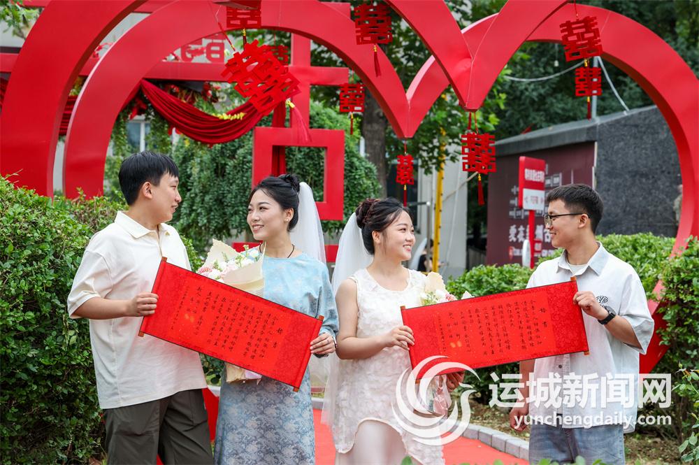8月29日,由市委宣傳部、市文明辦、運城日報社主辦的“愛在七夕見文明 移風易俗新風尚”暨新絳縣結婚登記頒證儀式在新絳縣民政局機關大院舉辦。10對新人集體領取了結婚證,并共同宣讀婚事新辦倡議書。