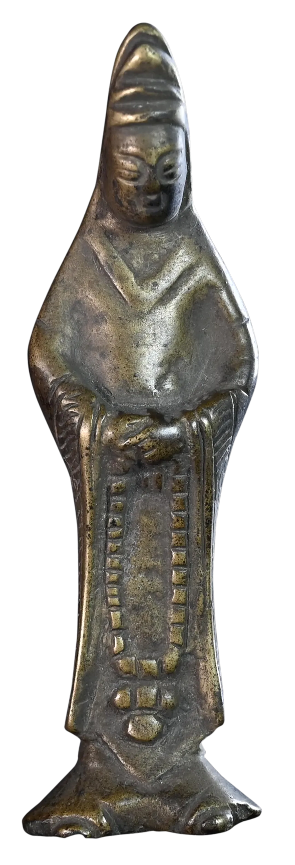 在清代,佛教文化得到了進一步的傳承與發展,這尊銅雕立佛造像就是當時佛教造像藝術的珍貴實物例證。這尊小佛像體現了清代工匠“小中見大”的精湛技藝,佛像手持念珠的細節刻畫,更是需要高超的雕刻技術。它不僅具有重要的藝術價值,更是研究清代宗教文化、社會生活與工藝技術的重要資料。