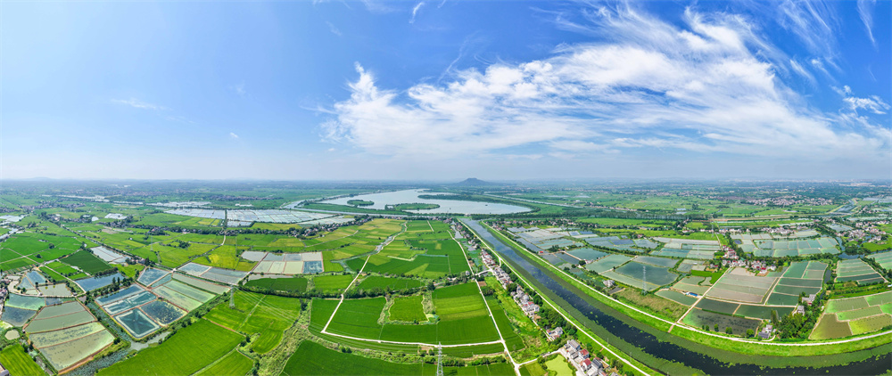 9月15日拍攝的句容赤山湖及周邊農田(無人機全景照片)。