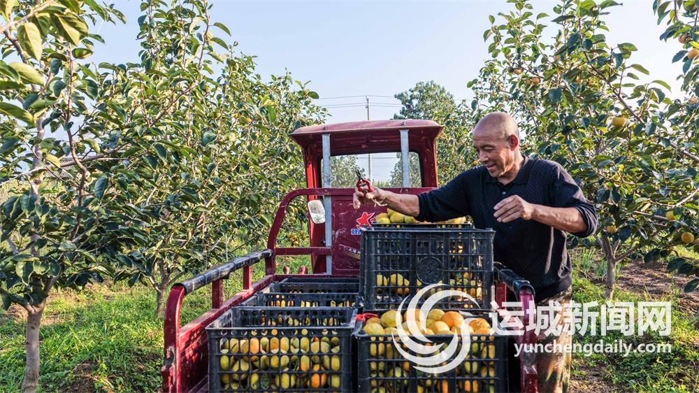 9月24日,永濟市蒲州鎮常家堡村的柿農在連片的柿子種植基地里,搬運剛剛采摘的陽豐2號脆甜柿子。