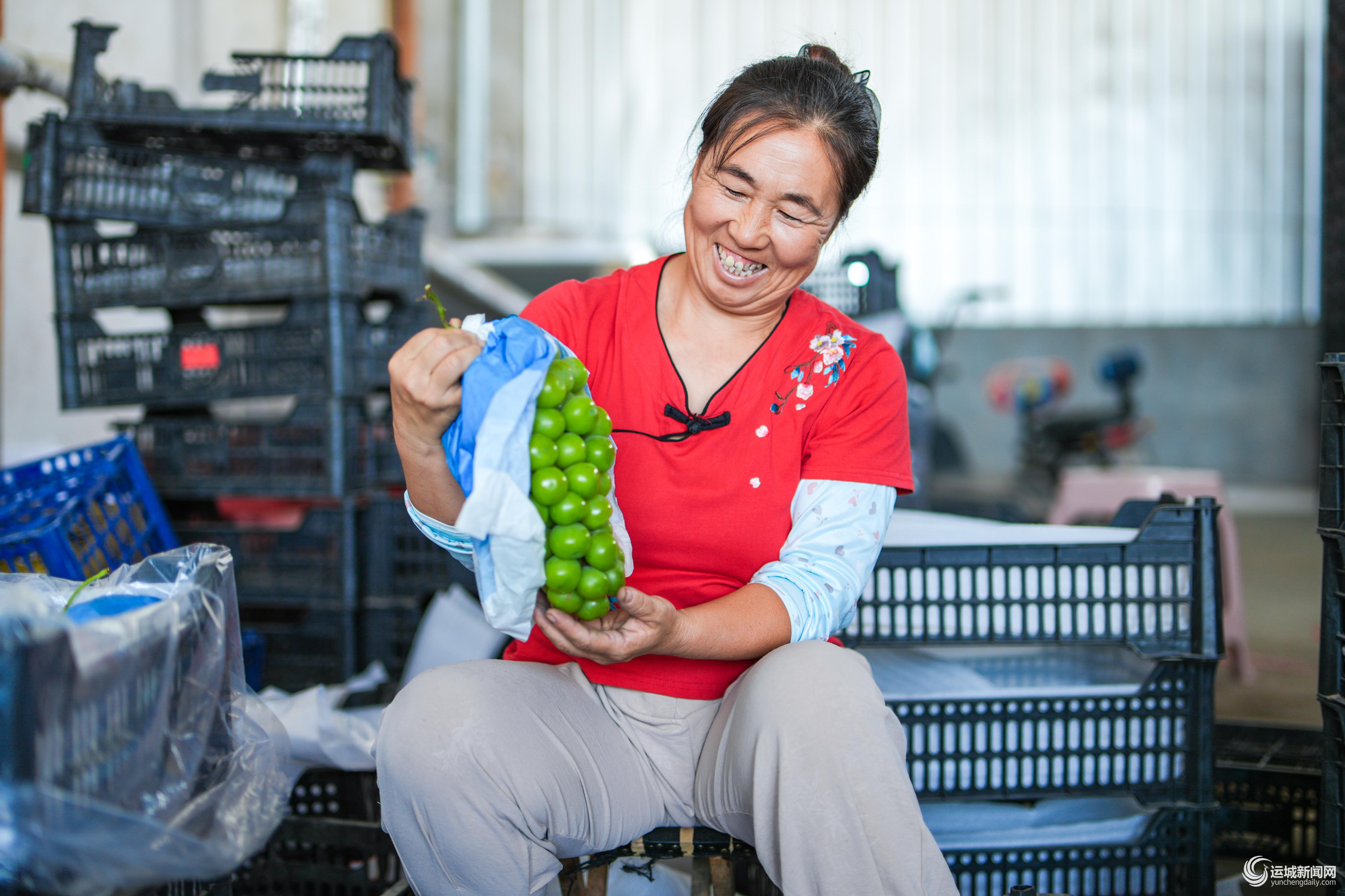 “我在這里主要的工作就是打包葡萄,葡萄包裝好之后就送冷庫(kù)。我一般早上6點(diǎn)從家里出發(fā),下午6點(diǎn)工作結(jié)束。”來(lái)自虞鄉(xiāng)鎮(zhèn)屯里村的左運(yùn)紅一邊打包一邊說(shuō)。