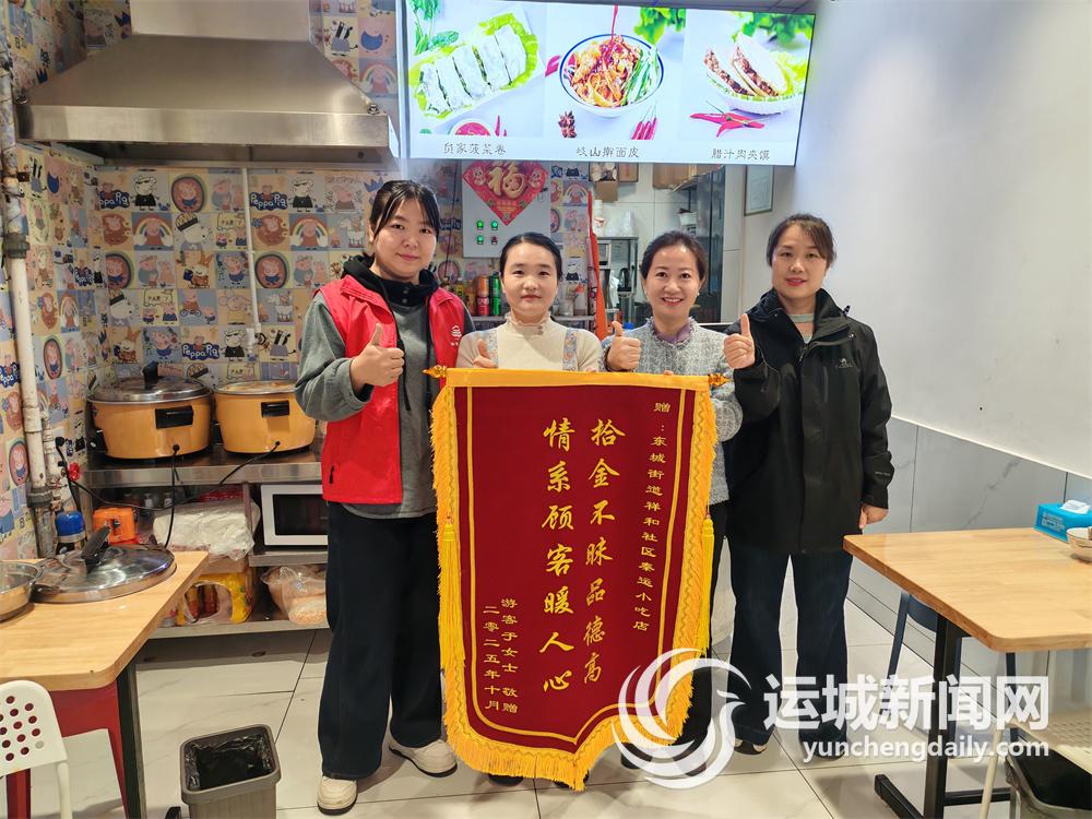 又訊(記者 杜磊 陳怡霏)10月15日上午,鹽湖區東城街道祥和社區秦運小吃店收到一面特殊的錦旗,感謝該店店員拾金不昧的高尚品質(右圖)。起因是國慶期間,來自山東威海的游客于女士在該店就餐時,不慎將相機遺失,第二日返回店里尋找時,店員確認身份后第一時間將物品歸還。