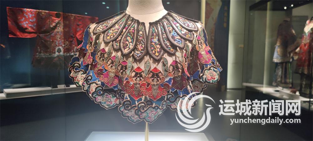 運(yùn)城博物館《綺繡華裳——清代漢族女性服飾專題展》展出的五彩緞地福壽紋圓形云肩 記者 劉亞 攝