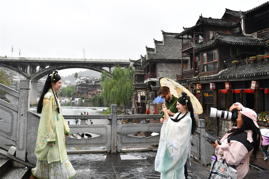 11月6日,外國游客身著“中國風(fēng)”服裝在鳳凰古城拍照、游玩。