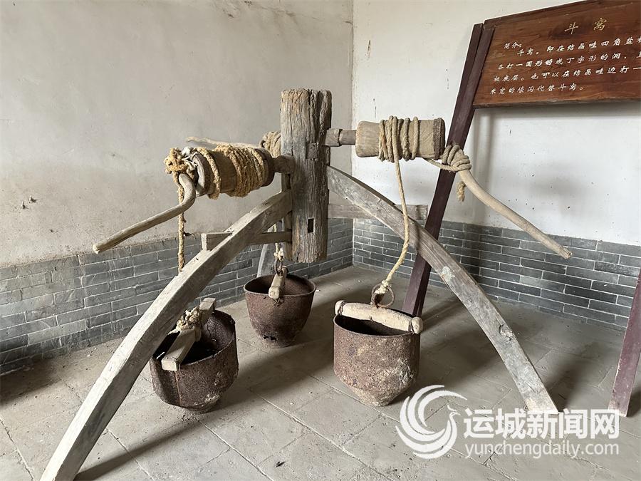 房內陳列著一木支架,旁有標識介紹。清光緒六七年間(1880~1881),首次在鹽湖東南部土質比較堅硬的地區鑿井。井邊初用四角方木支架加固,后改成六角形支架,所鑿井得名“木盤井”。它是世界鹽湖固相礦床采用鑿井法、井組連通法水溶開采的最早例證,用來抽取深層高濃度含礦鹵水,與鹽湖水調配使用。