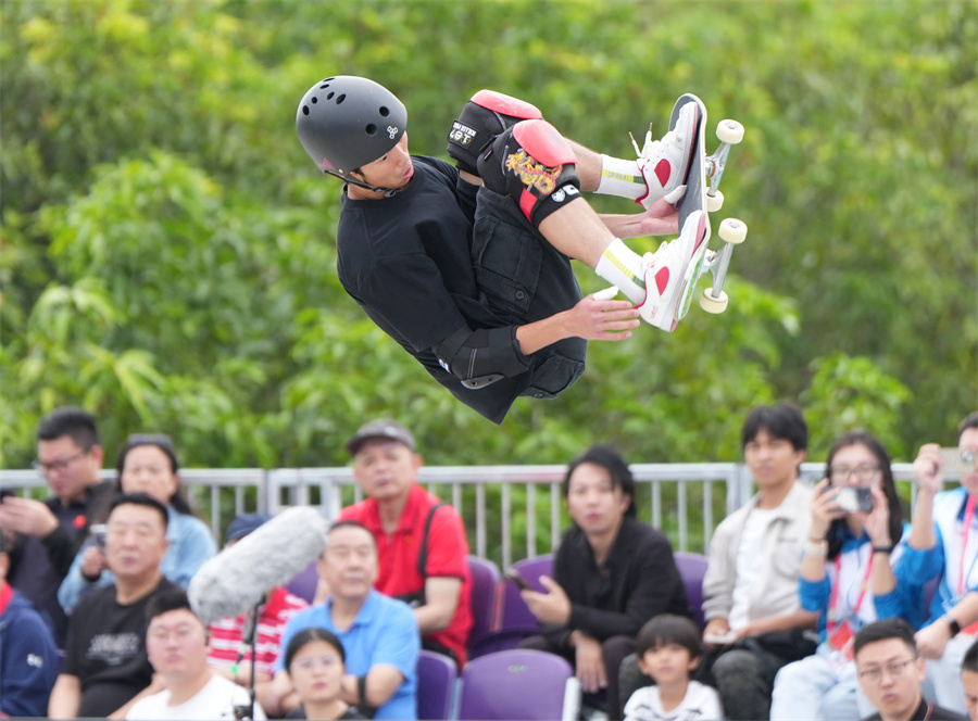 11月10日,福建隊選手吳博文在比賽中。他以67.68分的成績晉級決賽。當日,第十五屆全國運動會滑板男子碗池賽半決賽在廣東惠州舉行。 新華社記者 劉坤 攝