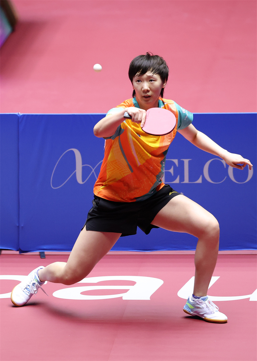 11月11日,黑龍江隊選手王曼昱在比賽中回球。當日,在澳門舉行的第十五屆全國運動會乒乓球女子單打十六分之一決賽中,黑龍江隊選手王曼昱4比3戰(zhàn)勝山東隊選手范思琦,晉級下一輪。