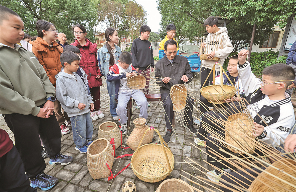 11月12日,在長興縣泗安鎮羅家地村的文化廣場,學生們在竹編藝人的帶領下學習竹編技藝。 11月12日是浙江省湖州市長興縣實施秋假的第一天,當地中小學生迎來了為期三天的秋假假期,長興縣泗安鎮社工站在羅家地村愛心驛站組織開展了“冬日暖心·愛心同行”活動。泗安鎮社工站組織“愛心媽媽”、民間藝人、青年志愿者帶領當地的中小學生參加繪畫、旱船、竹編、手工等文娛活動,活動聚焦鄉村青少年心理健康、親子關系、社會適應與綜合能力發展,構建“學校—家庭—村社”三位一體的愛心驛站,助力鄉村青少年快樂成長。 新華社記者 徐 昱 攝