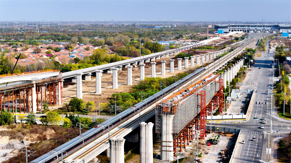 11月16日,由中鐵十局承建的濟(南)青(島)高鐵濰東上行聯絡線跨濰坊市藍天路連續梁完成合龍施工。 新華社記者 郭緒雷 攝