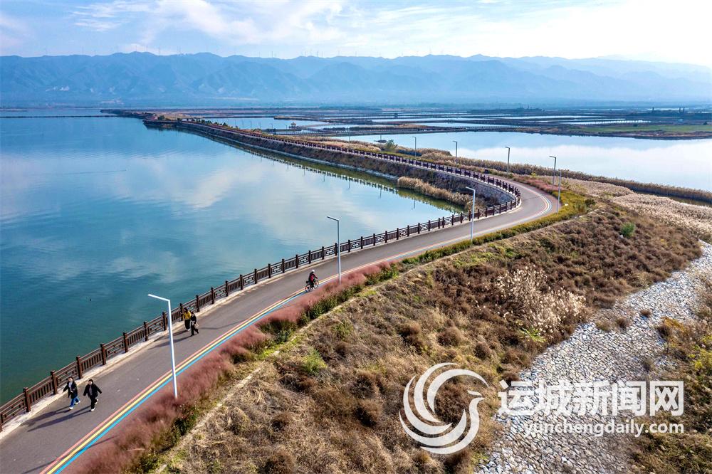 11月15日,鹽湖區鴨子池濕地公園內,市民騎行或漫步在蜿蜒的彩虹步道上,盡享愜意時光。