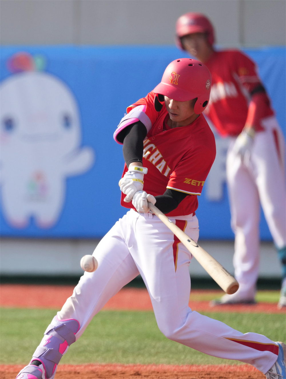 11月17日,上海隊球員丁宇澤(前)在比賽中擊球。當日,在廣東省中山市舉行的第十五屆全國運動會男子棒球小組賽A組比賽中,上海隊8比0戰勝廣東隊。