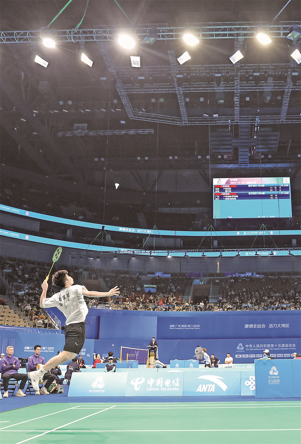 11月18日,福建隊選手翁泓陽在比賽中回球。當日,在深圳舉行的第十五屆全國運動會羽毛球男子單打半決賽中,福建隊選手翁泓陽2比0戰勝安徽隊選手董天堯,晉級決賽。