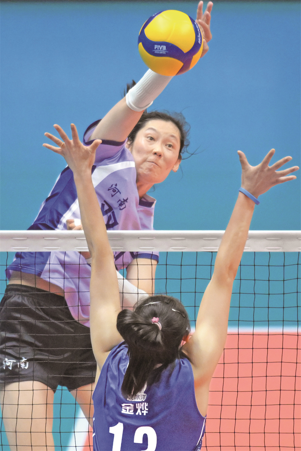 11月18日,河南隊(duì)球員朱婷(上)在比賽中扣球。