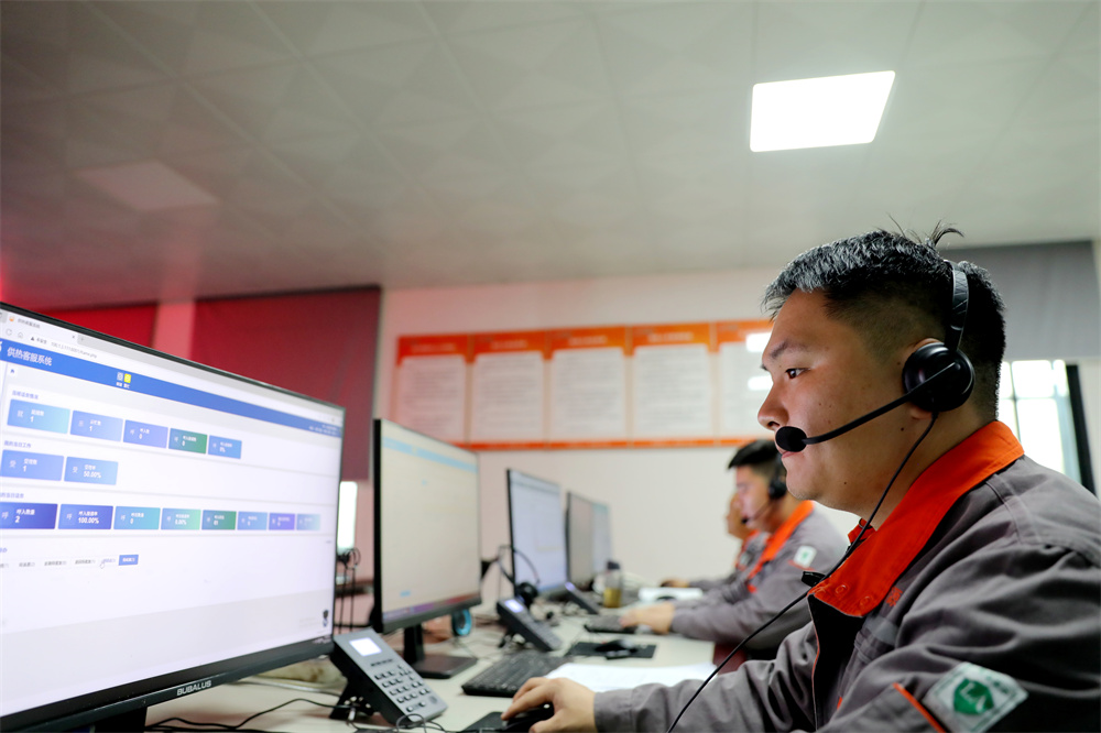 在河南省濟源市城市供熱調度中心,工作人員在接聽供暖熱線。